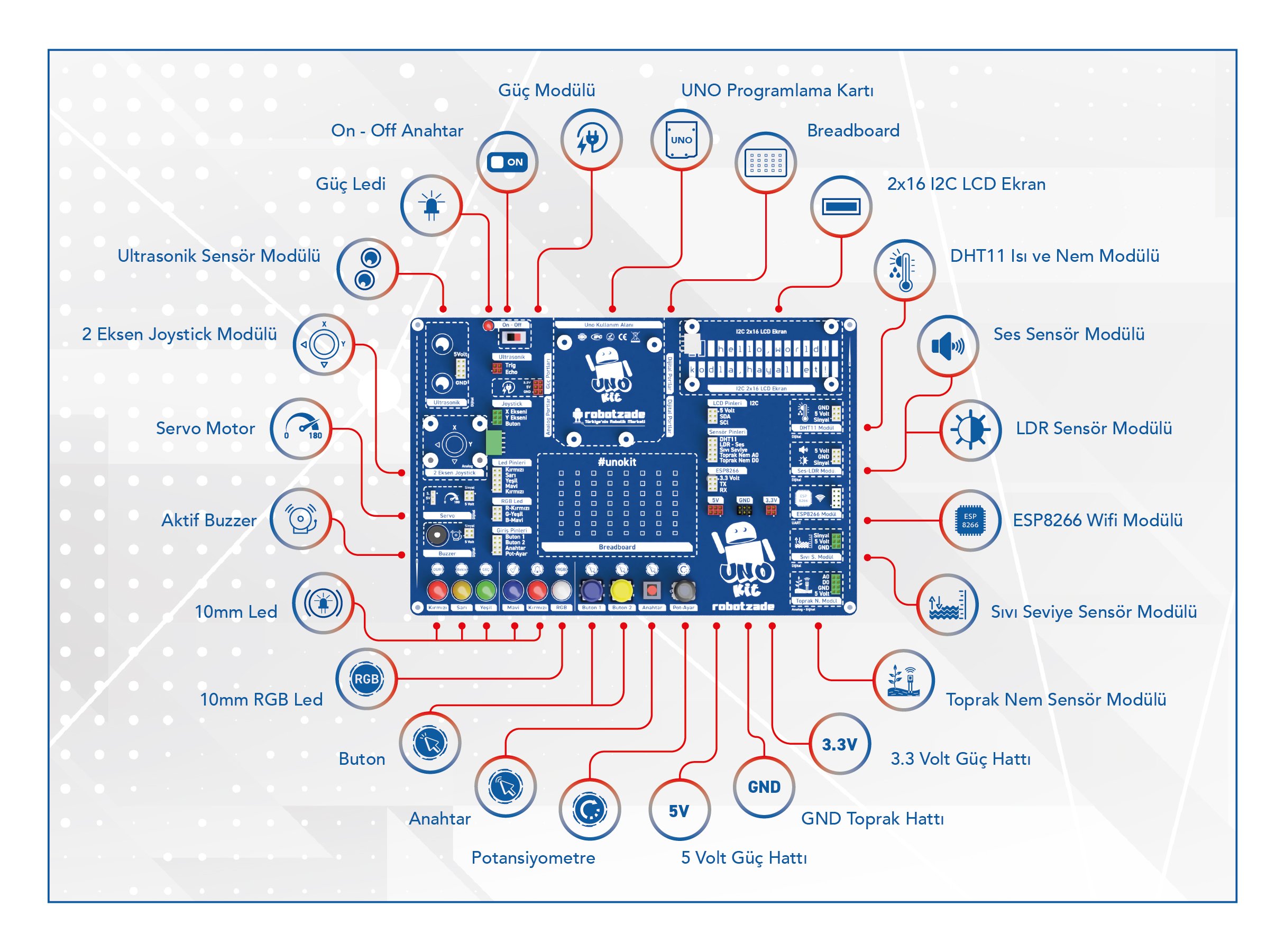 Geleneksel Arduino setlerinde sensörler, modüller ve bağlantılar ayrı ayrı dağınık şekilde gelirken, UNO-Kit sayesinde tüm bileşenler düzenli, etiketli ve hatasız bağlantı yapabileceğiniz şekilde tek kart üzerinde sunulmaktadır. Bu özelliğiyle hem eğitimde hem de bireysel projelerde zaman tasarrufu, hata oranında azalma ve kolay kullanım avantajı sağlar.