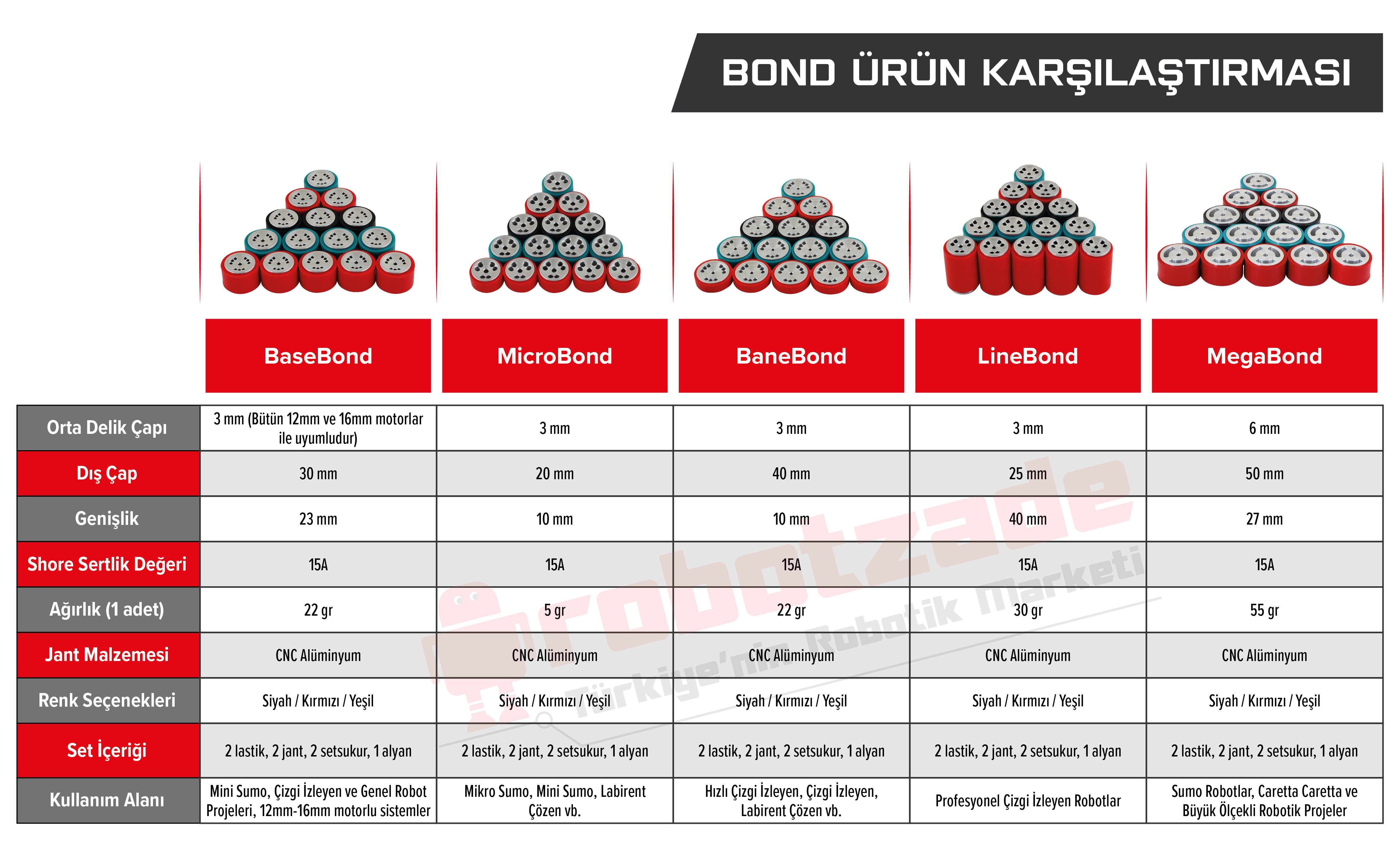 Robotzade tarafından üretilen Bond silikon tekerlekler, mini sumo robot ve çizgi izleyen robot başta olmak üzere bir çok robot projelerinde üstün performans sunmak üzere geliştirilmiştir.