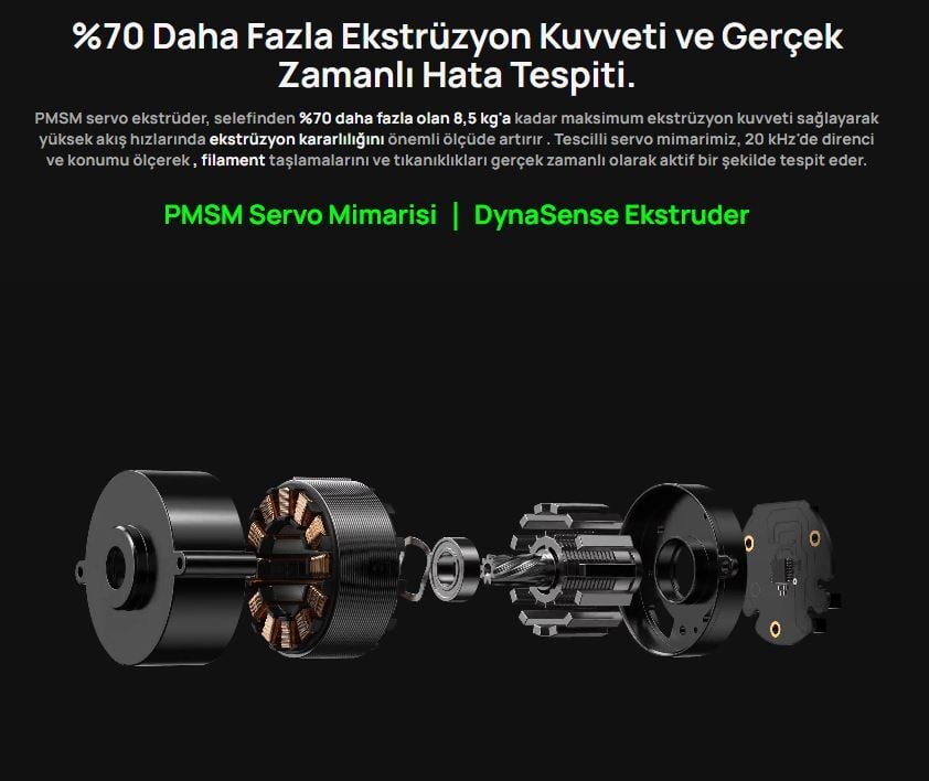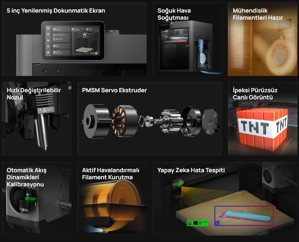 - Filament Desteği: PLA, PETG, TPU, ABS, ASA, PA, PC ve kompozit filamentler