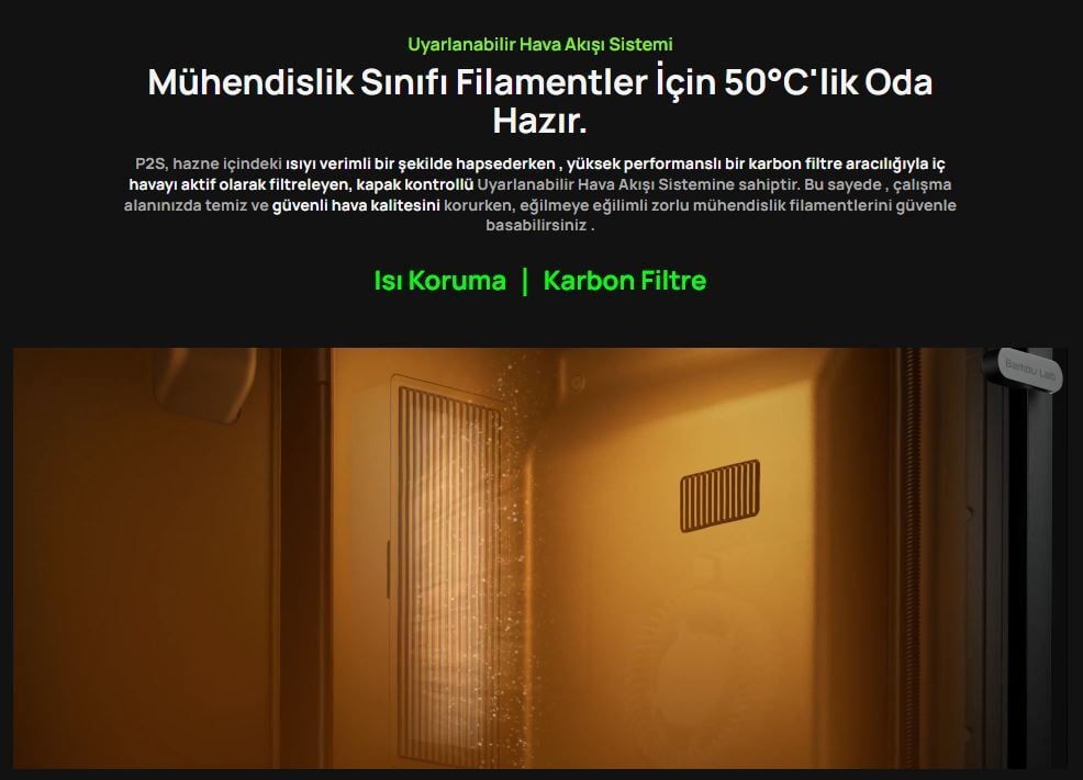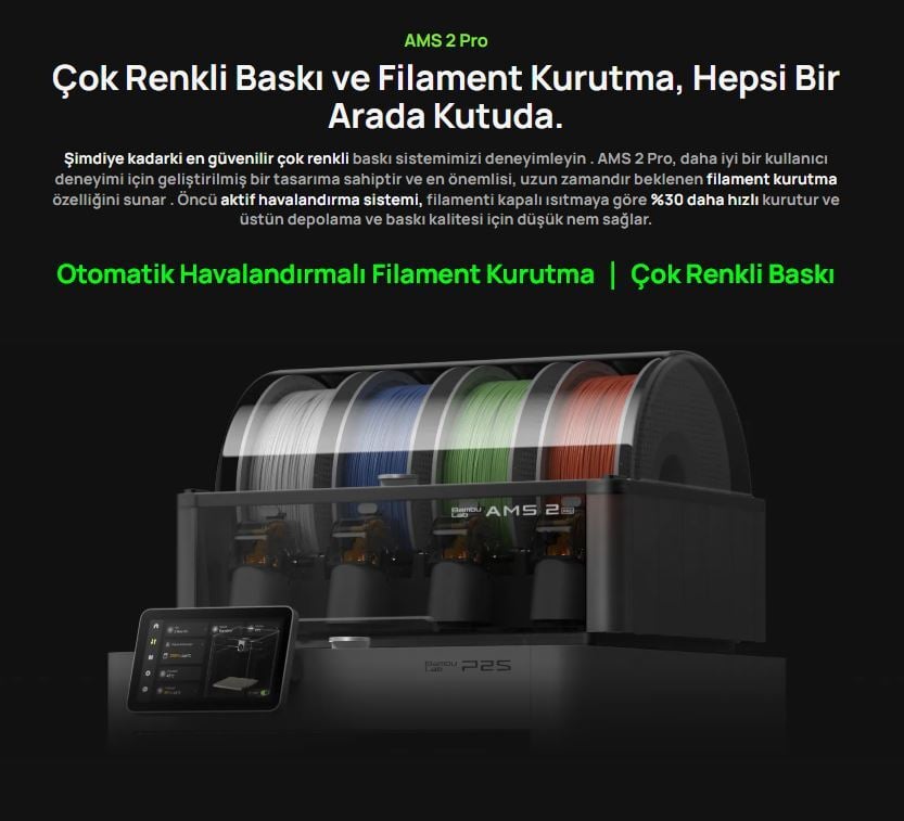 - AMS 2 Pro: 4 makaralı otomatik sistem + filament kurutma