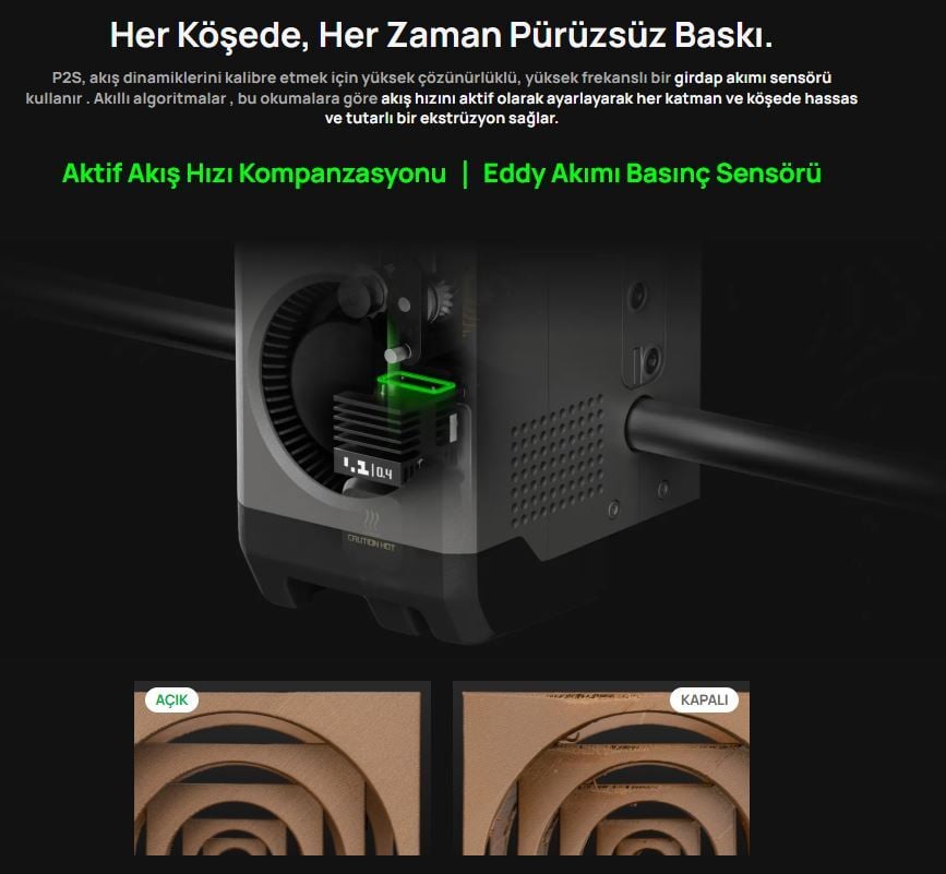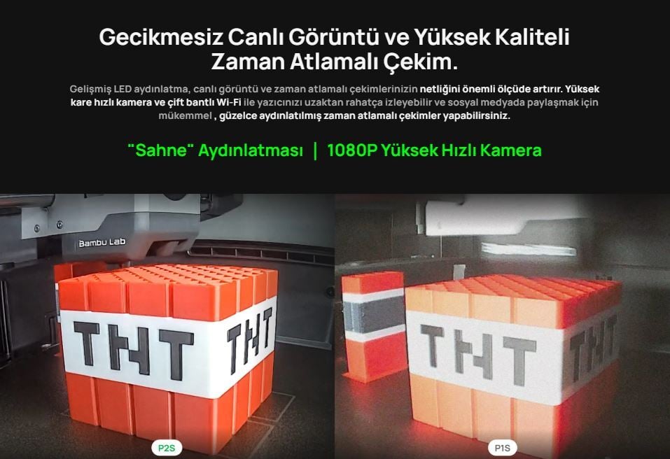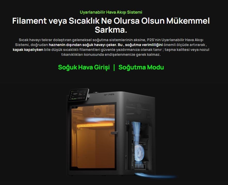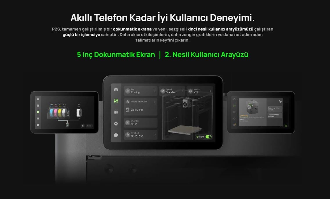 Bağlantı seçenekleri ve modern arayüzü ile Bambu Lab P2S Combo 3D Yazıcı, hem hobi kullanıcıları hem de profesyonel atölyeler için güçlü ve güvenilir bir 3D yazıcıdır.