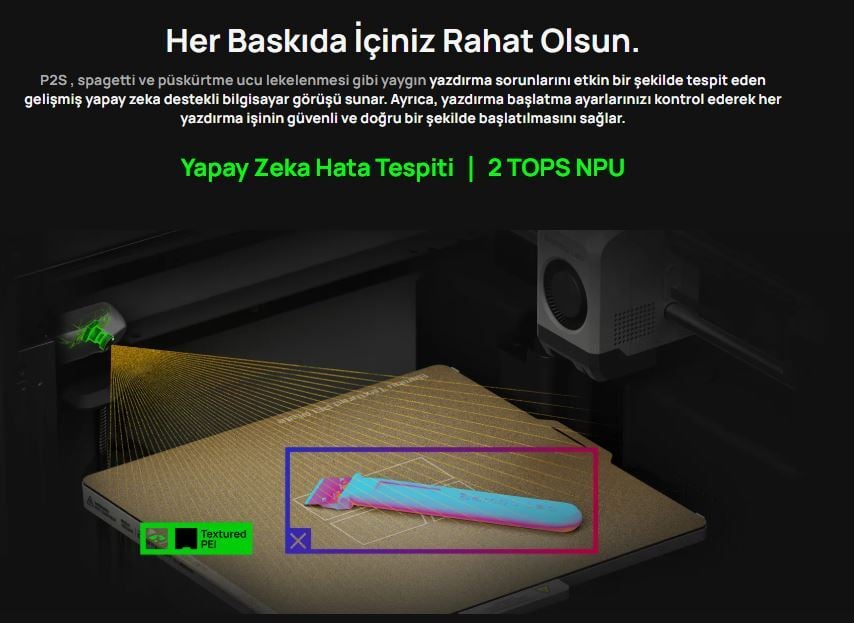 Gelişmiş yapay zekâ desteği ile donatılan Bambu Lab P2S Combo 3D Yazıcı, spagetti hatası, nozul tıkanması ve ilk katman problemlerini otomatik olarak tespit eder. 1080p kamera ile canlı izleme özelliği sayesinde Bambu Lab P2S Combo 3D Yazıcı, üretim sürecini her an kontrol etmenizi sağlar.