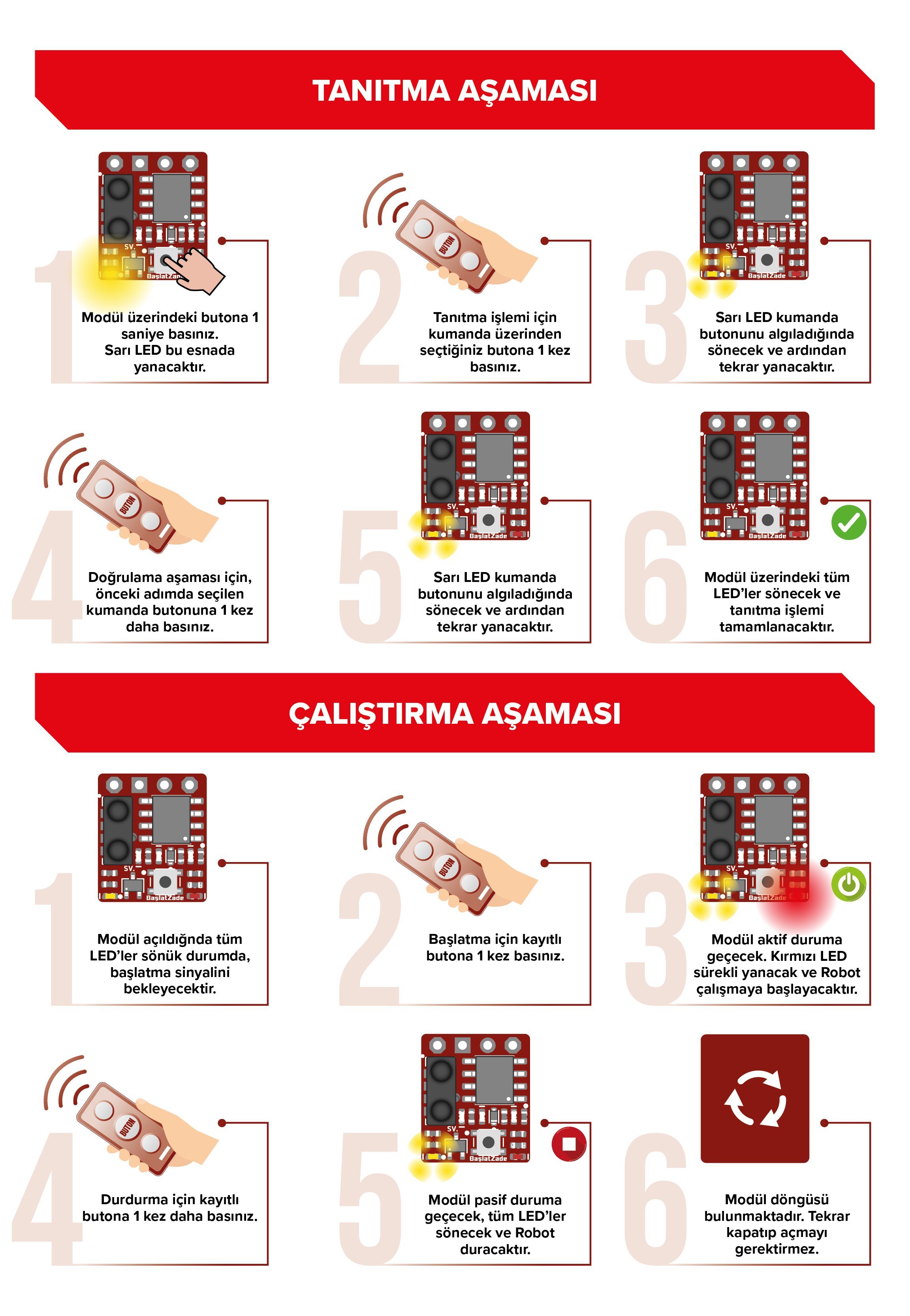 Başta Meb Robot Yarışması ve tüm Robot Yarışmaları için birebir uygundur. MEB tarafından paylaşılan resmi dökümanlara göre tasarlanmıştır. Tüm kumandalar ile rahatlıkla çalıştırabilirsiniz basit bir kullanımı vardır. Televizyon kumandası, klima kumandası, projeksiyon kumandası ve aklınıza gelebilecek tüm kumandalar ile uyumludur.