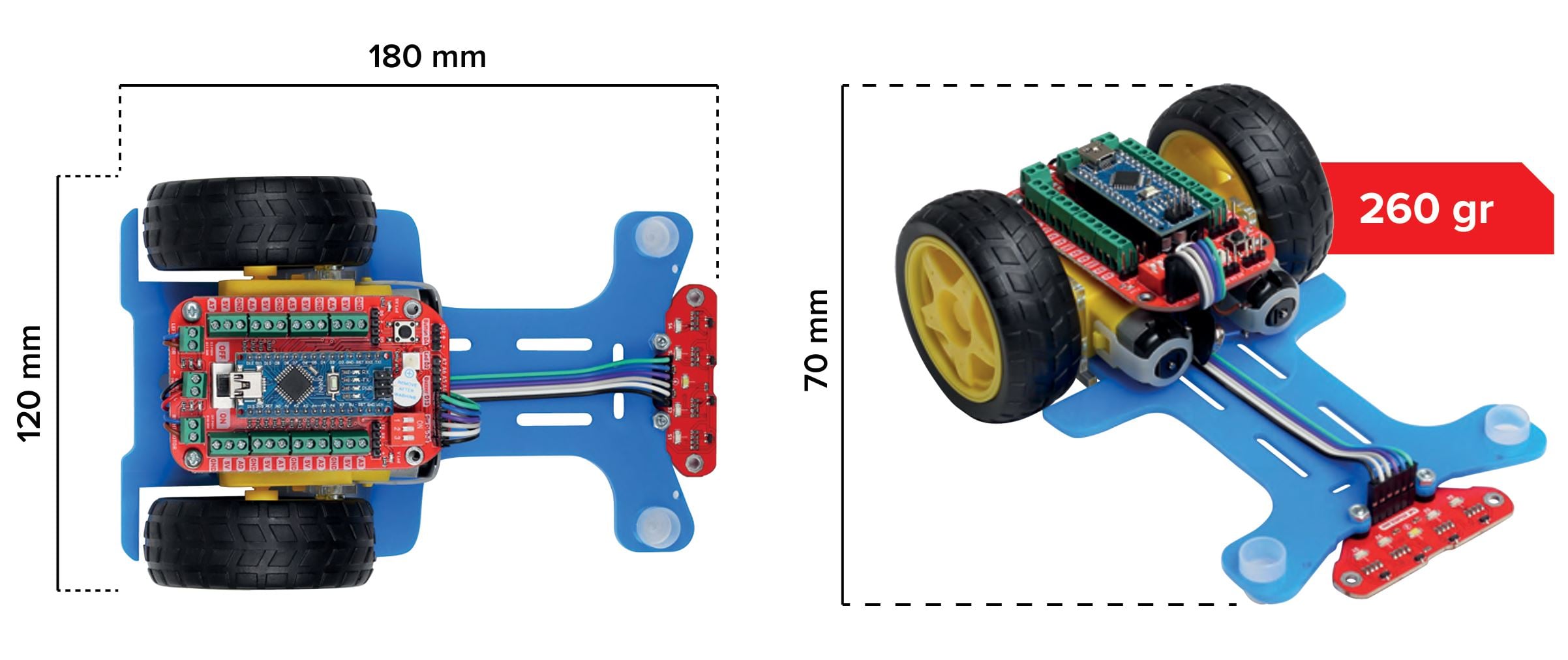Bluetooth modülü sayesinde robotunuzu telefon veya tablet üzerinden kontrol edebilirsiniz. Bu özellik ile robotun hızını ve çalışma parametrelerini anlık olarak değiştirebilir, her seferinde bilgisayara bağlama zorunluluğu olmadan robotunuzu kolayca geliştirebilirsiniz. Robotun ana kontrol kartı Arduino Nano’dur.