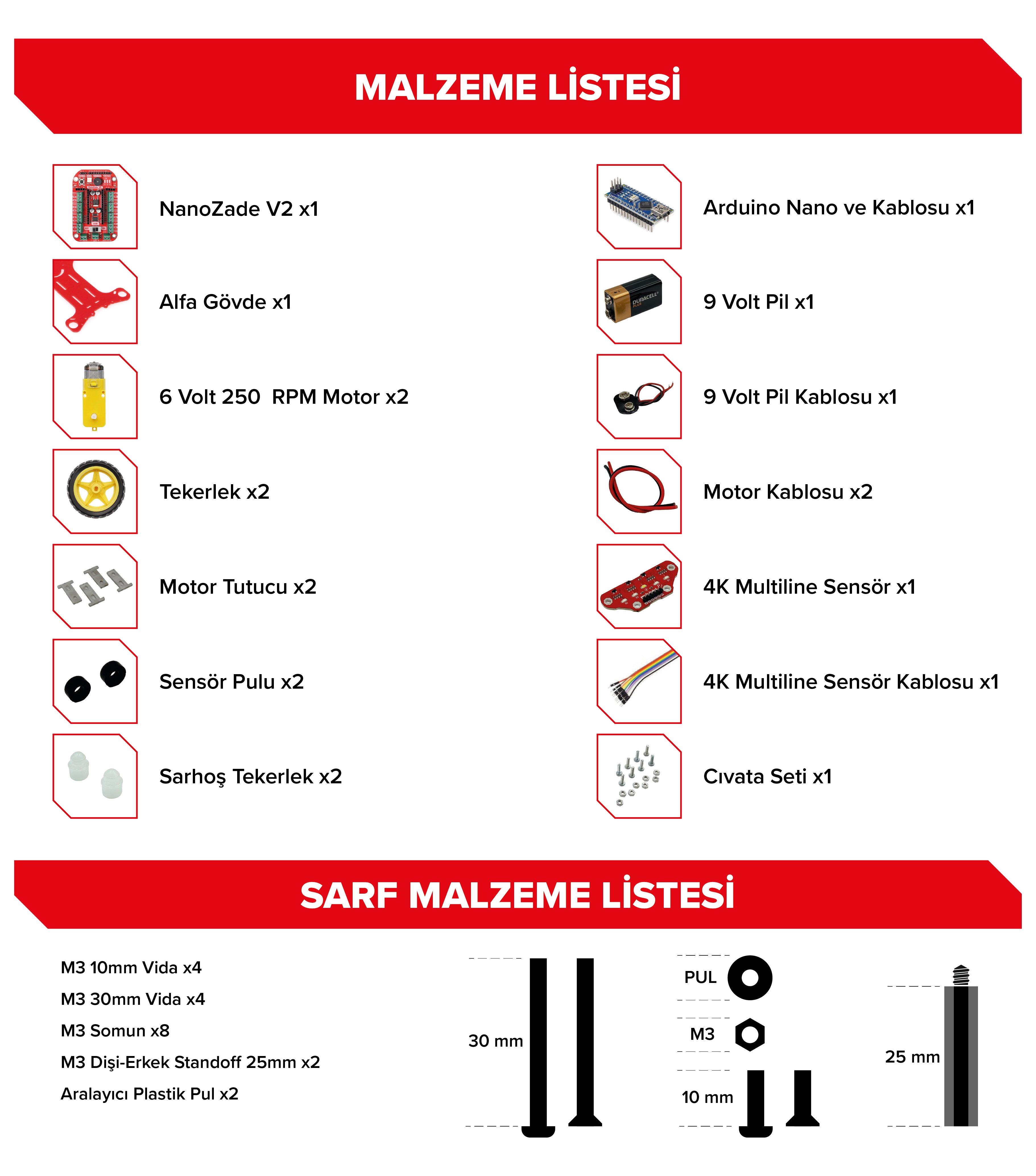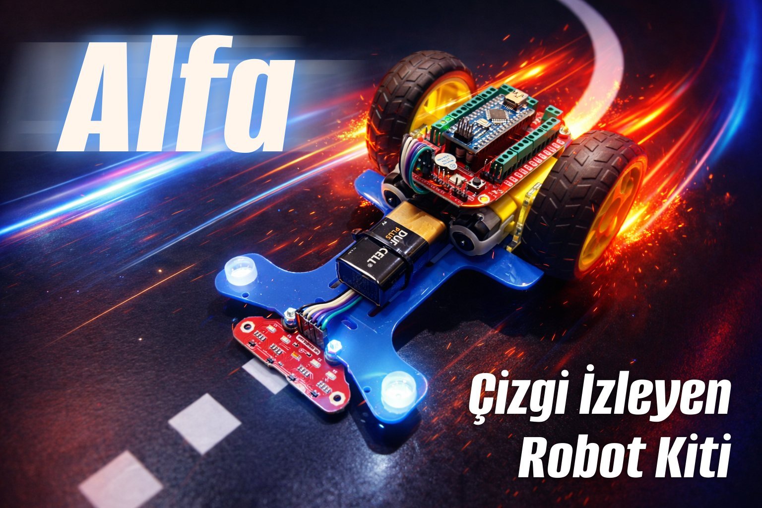 Alfa Çizgi İzleyen Robot Kiti; proje ödevleri, robotik eğitimleri ve bilim fuarlarında kullanıma uygun, ekonomik ve pratik bir robot kitidir.