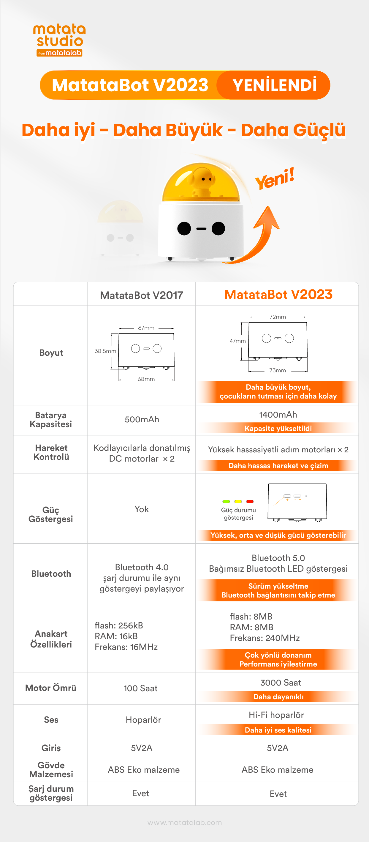 MatataBot bir robot arabadır. Yazdığınız kodlara göre hareket edip ses çıkartır. Kodlama dünyasına giriş yaptığınızda buradaki maceralarınızda sizinle olacak. Rota takip ettirebilir, kalemini kullanarak çizim yapablir istersenizde şarkı söylettirebilirsiniz. Matatalab Kodlama Seti STEM konularını öğrenmenizde size yardımcı olacak ve problem çözme yeteneklerinizi geliştirecek.