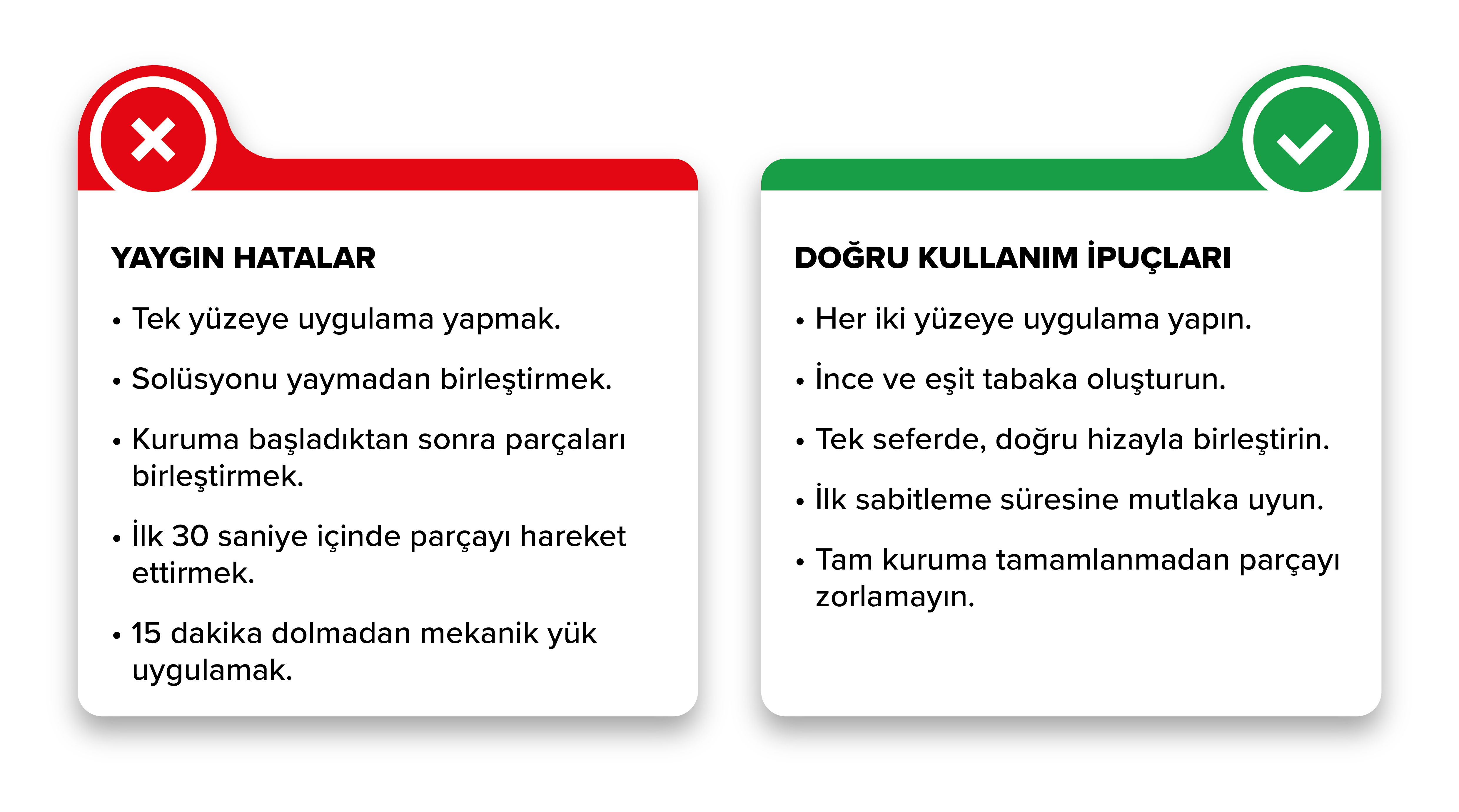 Klasik yapıştırıcılar, parçalar arasında sert ve gevrek bir ara katman oluşturarak yalnızca yüzeysel tutunma sağlar. Bu yapı, darbe, titreşim ve sürekli mekanik yük altında mikro çatlaklara ve ani ayrılmalara yol açar. Solid Weld, bu yaklaşımın aksine, birleştirilen yüzeyler arasında daha homojen ve dengeli bir birleşim bölgesi oluşmasını sağlar.